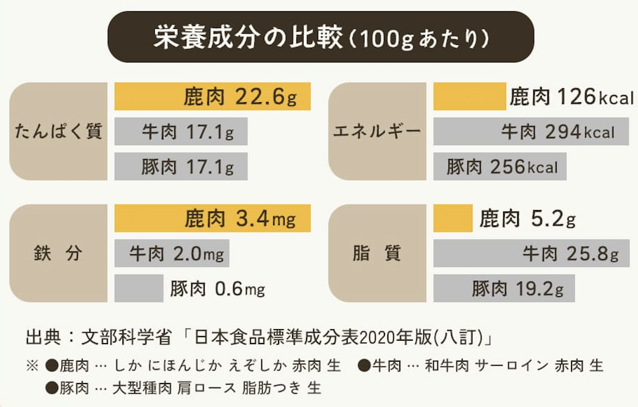 鹿肉は高タンパクで必須アミノ酸やヘム鉄が豊富に含まれています。